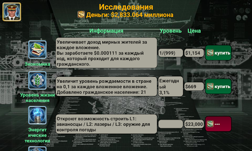 * Ресурсы, фабрики, фондовая биржа, рынки оружия, дипломаты, альянсы, Организация Объединенных Наций, Центр Шпионажа, Военная комната, Экономическая система, Технология, Мировые события, Мировые новости и продвинутый искусственный интеллект.