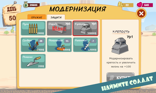Наймите автоматчиков и ракетчиков чтобы защитить башню в течении 50 уровней зомби-атаки. Не забудьте про ремонтников которые будут ремонтировать вашу башню по мере разрушения. Используйте разное оружие начиная от пистолета и заканчивая пушкой чтобы помочь обороняющимся из башни. Стреляйте, убивайте, зарабатывайте деньги и модернизируйте атаку/защиту!
