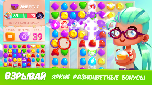 Совершенно новый подход к играм "три в ряд". Тебе точно понравится! Захватывающий гемплей: тасуй и совмещай фишки, находите новых друзей на захватывающем и полном приключений пути!