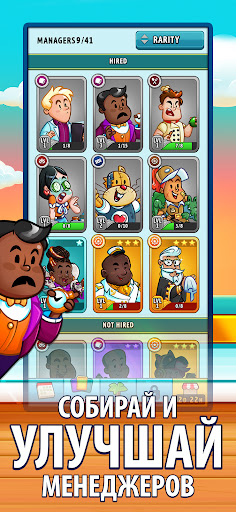 Находи и собирай менеджеров, которые помогут тебе превратить твой курорт в поистине райский уголок! У каждого менеджера будут свои преимущества и способности, так что выбирай с умом! Повышай своих сотрудников, и они начнут приносить больше прибыли, а ты станешь еще на шаг ближе к тому, чтобы стать настоящим курортным магнатом!