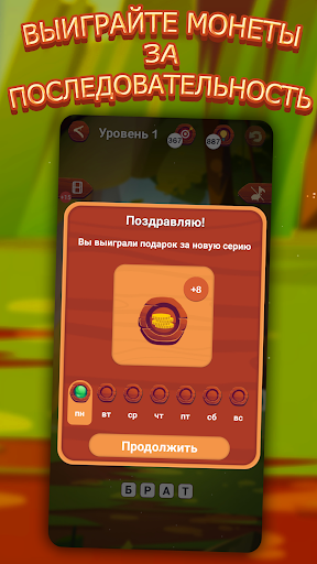 ✔️Создавайте серии и получайте награды каждый день. Используйте подсказки, когда не можете подобрать слово, и покупайте подсказки на заработанные монеты.