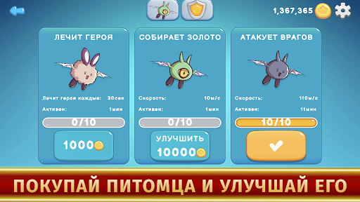 Для усиления героя можно приобрести питомца. Всего их три и все они разные: один помогает собирать монеты, второй атакует врагов, третий лечит. Каждого из них можно улучшать. Для прохождения уровня можно выбрать только одного из них.