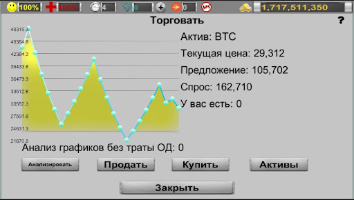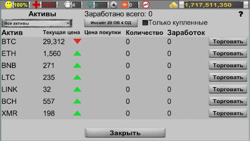 - возможность торговать на бирже более чем 40 активами. Акции, товары и криптовалюты реагируют на изменение состояния экономики в игре, а при достаточно высоких заработках и хороших отношениях с политиками игрок сам сможет оказывать влияние на рынок;