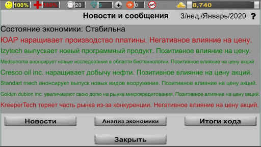 Бизнес стратегия 3 – пошаговая стратегия, легкий симулятор биржи, продолжение и развитие двух предыдущих игр Бизнес стратегия 2 и Бизнес стратегия. Эта несложная экономическая стратегия для тех, кто без риска хотел бы попробовать ощутить азарт фондового рынка.