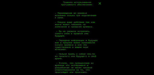 Путешествие во времени это не фантастика, с этой игрой это становиться реальностью. Вы можете переместиться в любое время из допустимого столетия. Вы можете вернуться в прошлое и застать людей от которых вы восхищались, или же на оборот в будущее и посмотреть что там происходит. Помните, что не стоит вмешиваться в время и всё что вы сделаете с помощью этой игры идет лишь на ваш страх и риск. С правилами и инструкцией пользования машиной времени вы можете в приложении. Будьте аккуратны, помните о законах времени.
