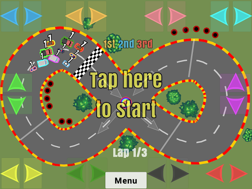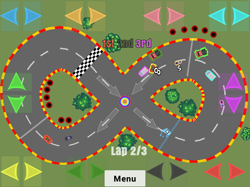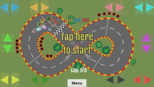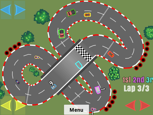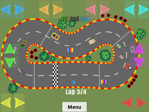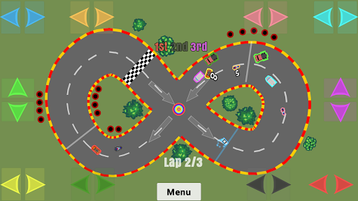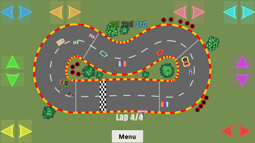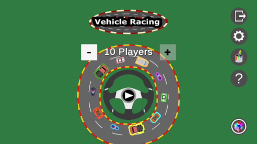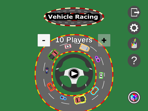 This is a car / vehicle racing game for 1, 2, 3, 4, 5, 6 , 7, 8, 9 or 10 players. Play together on a single phone or tablet. Vehicles accelerate automatically. Turn by using arrows or a joystick (can be changed in the settings menu). Race against friends or against the computer.
