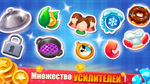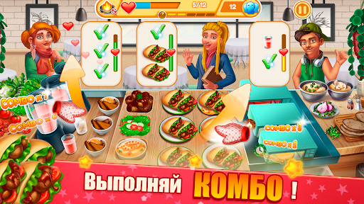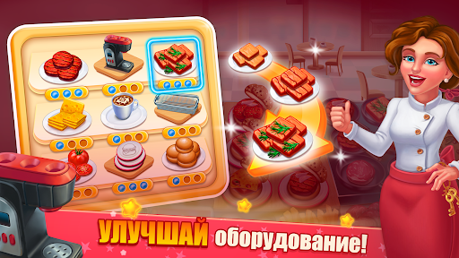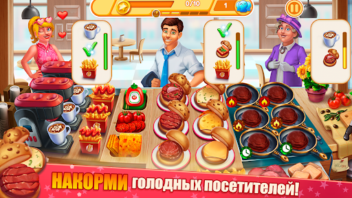 Эффективно управляйте временем, обучайтесь и достигайте целей, обслуживайте максимальное количество посетителей, собирайте монеты и энергию для модернизации кухни, делайте комбо и получайте дополнительную награду и бонусы.