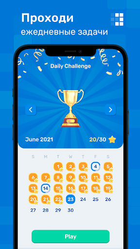 - Решайте ежедневные головоломки и получайте уникальные головоломки каждый день, затем решайте все головоломки за данный месяц и выигрывайте уникальный ежемесячный трофей.