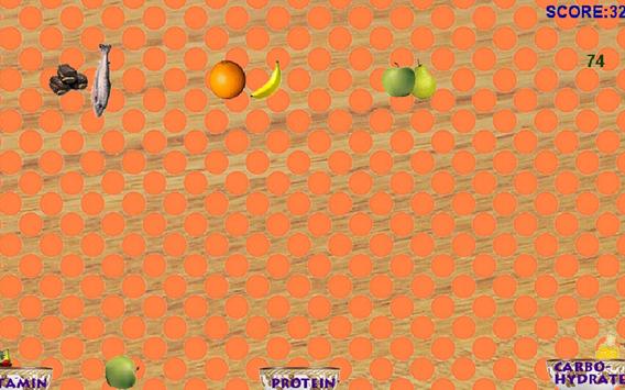 The game introduces the topic of good nutrition in a fun way by awarding points to balanced diet and penalizing bad eating habits.