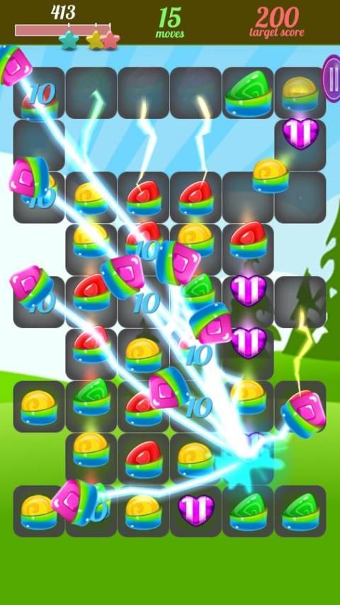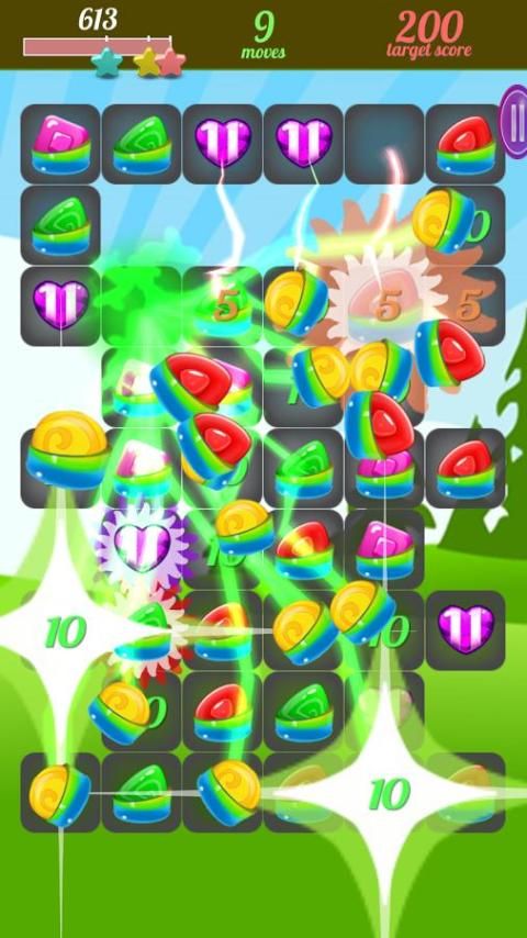 + Устройте 3 конфеты с одного цвета в ряд, чтобы взорвать их.