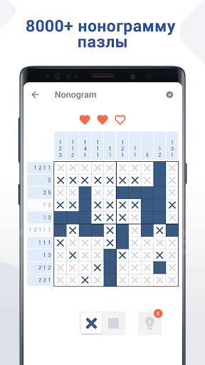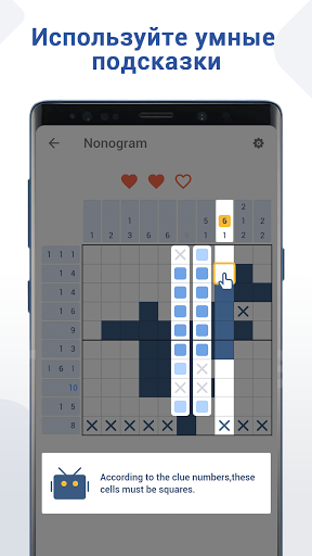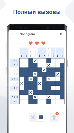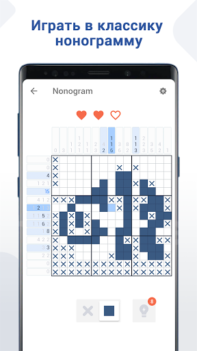 Бросьте вызов и наслаждайтесь классической игрой-головоломкой со скрытыми картинками! Nonogram подходит практически всем. Вам просто нужно следовать основным правилам и логике чисел, чтобы раскрыть раскраски. Цифры над или слева от сетки - это подсказки к головоломкам, которые указывают, сколько квадратов нужно закрасить в каждой строке или столбце. Также можно пометить крестиком неокрашенный квадрат.