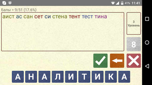 Цель игры - собрать как можно больше слов из заданного слова. На каждом уровне, возможно ввести десятки слов, в некоторых и больше ста. Для перехода на следующий уровень, Вы должны собрать минимальное количество слов, которое указывается в правой части экрана. Все результаты сохраняются и отображаются угаданные слова в каждом уровне.