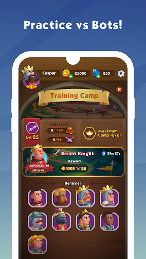 играть и практиковатьШахматы в веселой средневековой обстановке, когда вы обновляете разделы своего королевства, которые представляют различные действия, которые вы можете выполнять.Заработайте золото, мечи и свитки, наполненные шахматной мудростью!Получите новое снаряжение из магазина.Каждая победа помогает восстановить великолепие и процветание вашего королевства!Ваш уровень
