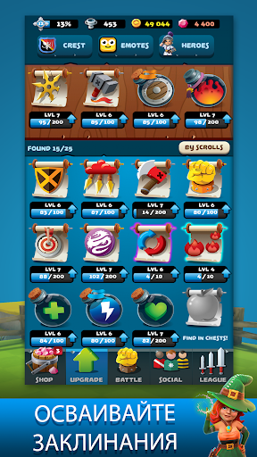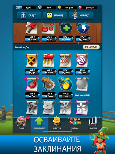Собирайте навыки, улучшения и заклинания в битвах и сундуках. Открывайте и улучшайте новые мощные способности, которые дадут вашему персонажу преимущество в бою. Подберите лучшее сочетание для каждого героя, чтобы одержать победу.