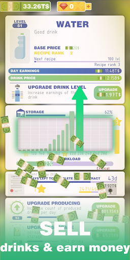 Ваша главная цель - создавать напитки и продавать их, строить и улучшать фабрики. Вам также необходимо управлять логистикой, чтобы оптимизировать доставку самым быстрым способом. Изучение новых ингредиентов и добавок для ваших напитков в лаборатории поможет вам заработать больше денег. Выполняйте разные квесты, выбирайте лучшие контракты, ловите быстрые машины, чтобы получить награды