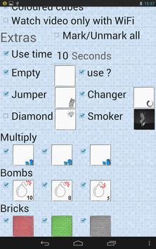 Custom game is what you get from free game plus a lot of extras.You can make your game much harder ,interesting and by your needs. In options you can add time, bricks, bombs, multi cubes, changers, jumpers, smokers, diamonds, empty and question cubes,for now.