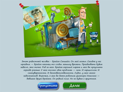 Твоя задача состоит в том, чтобы помочь Брайану остановить Доктора Ужасного в приключении полном загадок, исследований и, конечно же, путешествий во времени. Всё это вы сможете испытать в захватывающем научно-фантастическом приключении! 50 уникальных локаций, огромное разнообразие заданий, уникальный сеттинг, а также захватывающий и веселый сюжет - всё это вы сможете найти в нашей игре. Строй сооружения, приручай динозавров, организуй распределение ресурсов и строительство уникальных строений. Легкое управление и простые механики в игре помогут тебе быстро разобраться, как тут всё устроено. Но если сложности всё же возникнут - всегда будет возможность включить меню помощи.