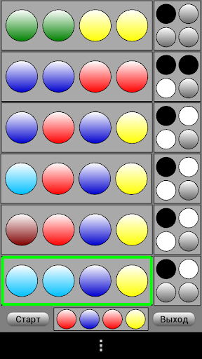 Игроку предлагается за шесть попыток отгадать код из четырех цветов. Каждая позиция кода может иметь один из шести цветов. Цвета могут повторяться среди позиций. После каждой попытки игрок получает результат совпадения в виде меток двух цветов (черного и белого). Черная метка дается в случае совпадения позиции по цвету и по положению. Белая метка дается при совпадении только по цвету. Каждая позиция оценивается только один раз.