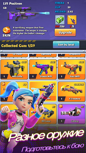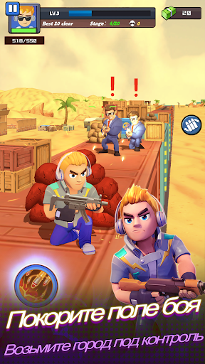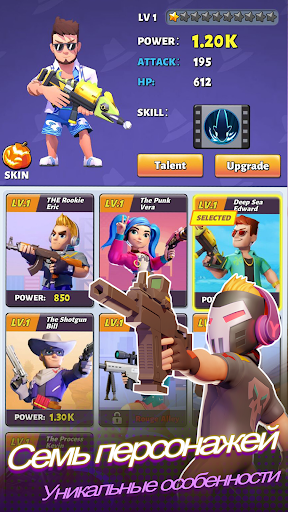 Проходите уровни и разблокируйте новых персонажей. У каждого персонажа есть уникальные навыки, каждый персонаж специализируется на своем оружии. Развивайте их таланты, чтобы усилить огневую мощь, – и они помогут вам сокрушить любого, кто встанет у вас на пути.