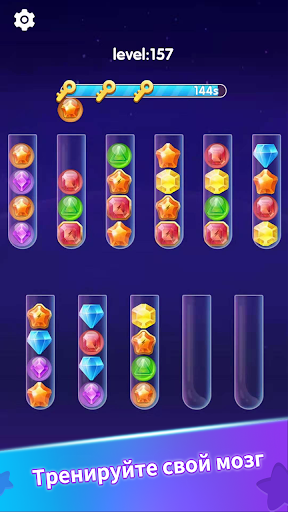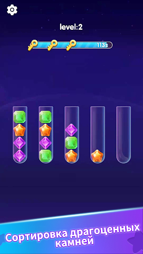 Попробуйте отсортировать цветные драгоценные камни в трубках, пока все камни одного цвета не останутся в одной трубке. Сложная, но расслабляющая игра для тренировки мозга!