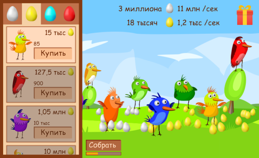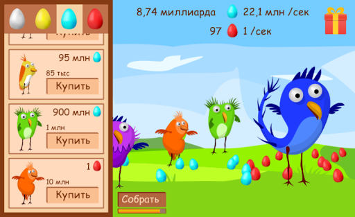 Каждая птица несет либо белые, либо золотые, либо красные, либо синие яйца. Цель игры - купить всех птиц.
