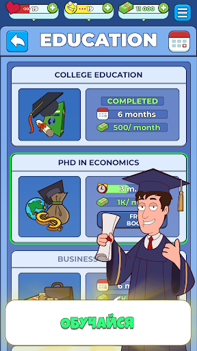 Находи первые способы заработать денег, утраивайся на работу, учись, карабкайся по карьерной лестнице, торгуй на бирже и выигрывай деньги в казино, покупай тачки, дома и самолёты, делай всё, что угодно, лишь бы стать главой всемирного банка, пока твой персонаж не умрёт от старости.