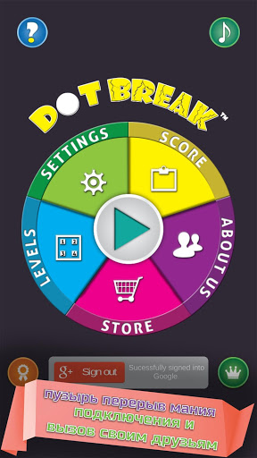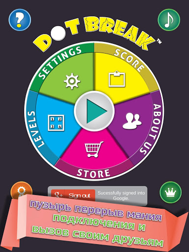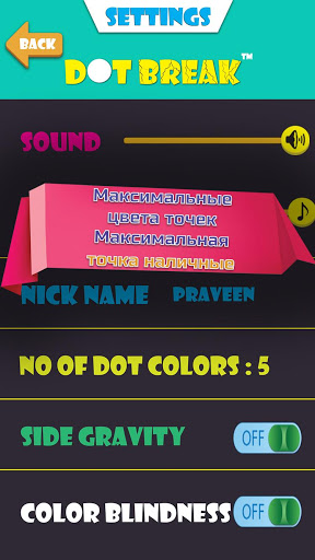 ✓in настройках можно дать кличку, вы можете регулировать громкость звуков и музыки, вы можете установить количество точек цветов (он будет работать только для свободной игры), вы можете включать и выключать цветовой слепоты и режим бокового тяжести