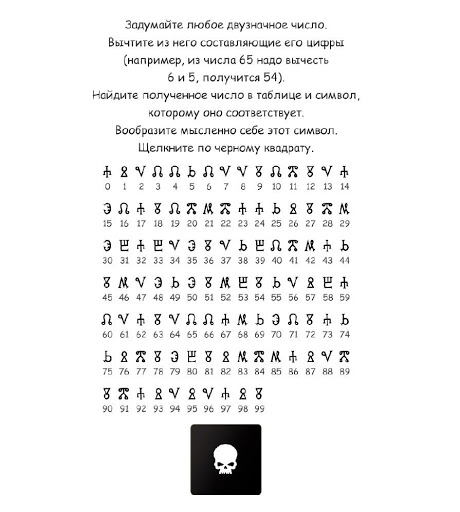 Есть таблица двузначных чисел и глаголических символов. Каждому числу присвоен один из десяти возможных символов. Нужно загадать какое-то число и найти символ, с ним связанный. Приложение предскажет то, что вы загадали