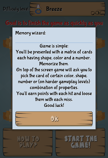 The goal of this puzzle game is to remember the position, color, shape and number of the cards and reveal them when asked for. Fun, quick, casual game suitable for any age. Includes several difficulty levels for kids, experienced players and masters.