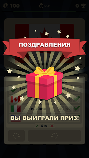 • Вызов - (Этот режим позволяет вам играть против ваших знакомых или случайных противников. Вы используете собранные флаги и определяете вопросы, на которые должен отвечать ваш оппонент, у него тоже есть такая же возможность. Тот, у кого есть больше правильных ответов, выигрывает приз).