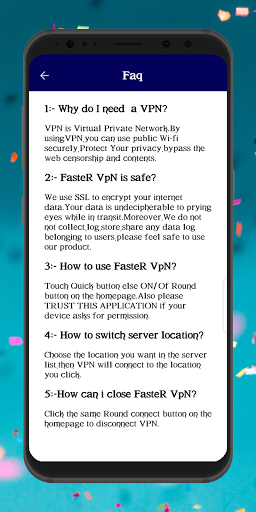 Вы беспокоитесь о потере данных во время ненадежных анонимных просмотров? Хотите избежать кибер-атак и кражи данных? Если ваш ответ да, это быстрее VPN будет вашим выбором номера 1. Используйте The USA VPN или любой другой сервер геолокации для подключения с зашифрованным прокси-соединением и свободно просматривать без страха за кибератам. Приложение Faster VPN шифрует весь трафик, приходящий на свой веб-сайт, поэтому вам не нужно беспокоиться о Spaming!