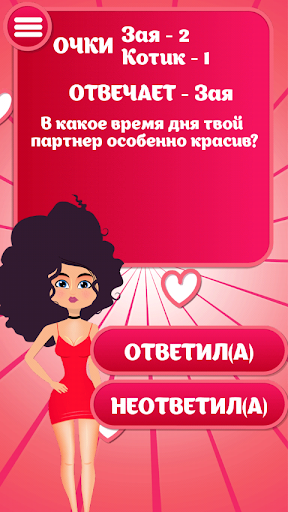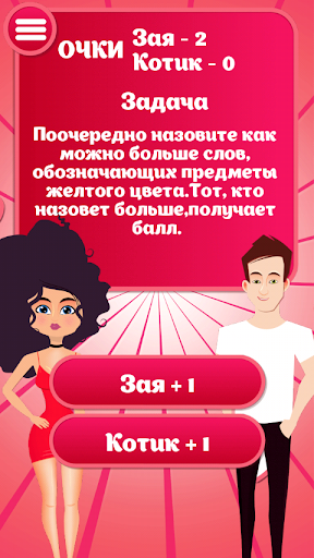 У каждого партнера есть задача- набрать первым победное количество очков, чтобы выиграть награду в конце игры..Награду получает выигравший, но указанное в ней задание выполняет проигравший. Право начать игру предоставляется девушке. В ходе игры вы будете поочередно отвечать на вопросы и выполнять задания для двоих. Если вы правильно отвечаете на поставленный вопрос или точно выполняете задание, вы получаете 1 очко. Игру выигрывает тот, кто первым наберет победное количество очков. Удачи!