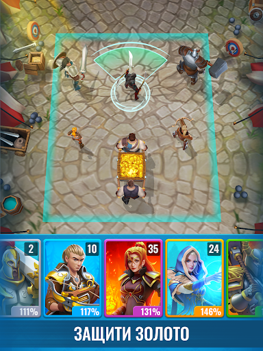 ГЕРОИ. В игре ты можешь собрать до восьми разных героев, будь то рыцарь или лучник или маг. Каждый из героев обладает своими способностями и умениями. Проходи уровень за уровнем и получай в сундуках новые умения. Прокачивай своих героев, чтобы они стали сильнее и здоровее и могли лучше отражать атаки врагов на твое золото. У каждого героя есть 5 скинов, которые меняются в зависимости от прокачки, так что скучать точно не придется!