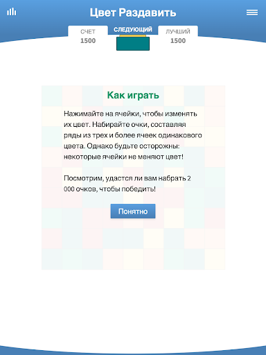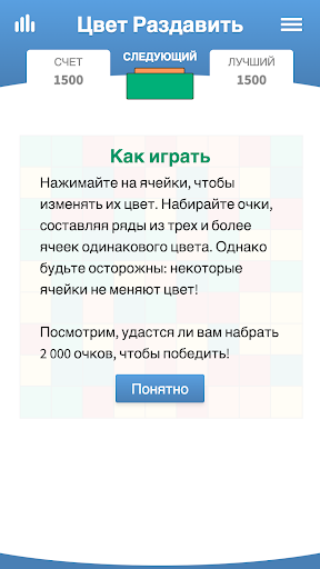 Цель игры - убрать с поля как можно больше ячеек. Игра начинается с поля, заполненного квадратными ячейками разных цветов. Нажмите на ячейку, чтобы изменить ее цвет на цвет, указанный сверху поля. Подберите три или более соприкасающихся ячейки одинакового цвета, чтобы убрать их и заработать очки. Если не удается подобрать три или более соприкасающихся ячейки одинакового цвета во время хода, игра завершается. Отточите свою стратегию и продолжайте игру как можно дольше, чтобы набрать очки и поставить рекорд. Посмотрим, удастся ли вам набрать 2 000 очков, чтобы выиграть! Однако будьте осторожны: некоторые ячейки не меняют цвет!