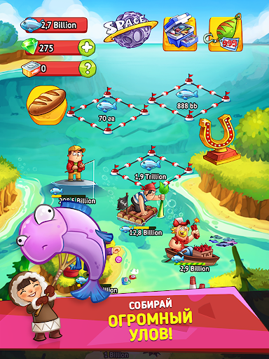 С развитием рыбной империи у тебя мистер Idle Fisher появится возможность развить свой бизнес далеко за пределами своей рыбной империи! Есть уникальная возможность половить рыбу на Марсе и открыть множество других потрясающих локаций!