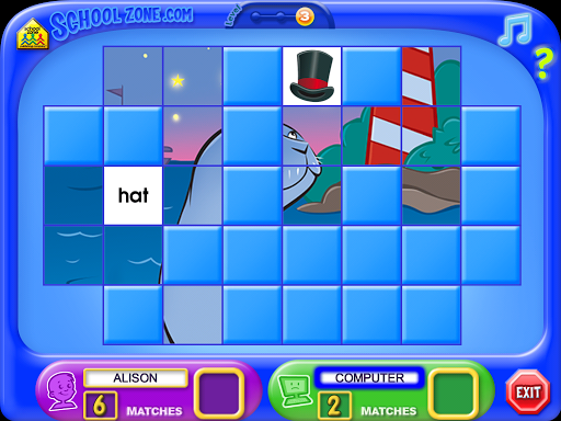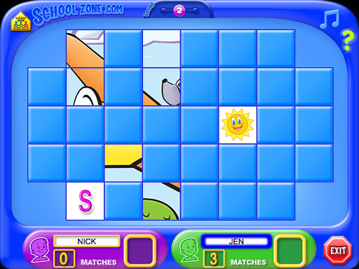 Насколько хорош память игрока? Нажмите любую плитку, чтобы «повернуть его» и увидеть изображение и коснитесь другой плитки, чтобы найти совпадение. Дети могут конкурировать с другом в режиме двух игроков или играть против встроенного противника. Игра имеет три уровня игры и пары: животное к детскому животному, картинку для начала буквы и фотографию на трехбуквенное слово. Нажмите любую плитку, чтобы увидеть, что там, а затем коснитесь другая плитка, чтобы найти совпадение. Попробуйте помните, что там, где для больших матчей. Игроки слышит личное письмо, животное или слово, проскаленное вслух. Если элементы в выбранных плитках совпадают, то этот проигрыватель выигрывает пару и снова воспроизводит. Если они не совпадают, плитки снова автоматически повернуты и воспроизводят пропуски в встроенный противник или второй проигрыватель. Игра продолжается до тех пор, пока последняя пара совпадает. Победитель - это игрок с самыми парами, с возможностью галстука для первого места. Добавленная функция - загадочная картина, скрытая за игровой доской. Каждый матч раскрывает его часть. Отделка игры раскрывает всю картину! Насколько быстрым игрок может парить все плитки?