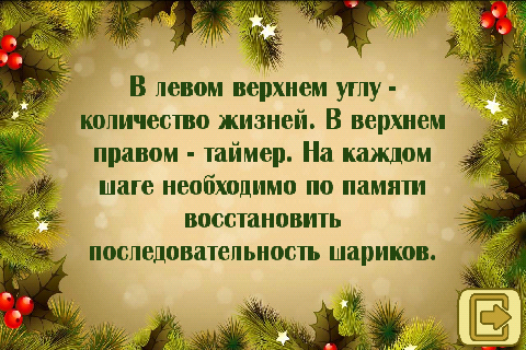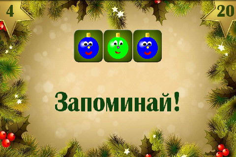 Тренируй память вместе с этим приложением! Новогодние шарики помогут тебе развивать память и устроят отличную тренировку для твоего мозга! Игра актуальна не только в Новый Год, но и в любое время. Играй, восстанавливая последовательности шариков по памяти, тренируйся делать это быстро и безошибочно!