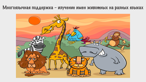 – Многоязычная поддержка - изучение имен животных на разных языках