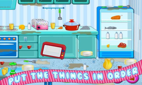 You will be able to use a variety of different tools to clean all the dirt and mess in the kitchen. Everything is out of its place and you have to put them back on their places. You will have to straighten the microwave, put plates back, straighten the glasses etc.