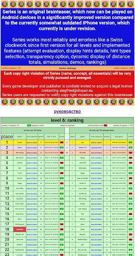 Эта версия Серии на Android предлагает очень удобную функциональность (Новый игрок и профессиональный режим, Опция прозрачности, выбор подсказок, Заранее проверяйте тесты, Визуальное отображение результатов теста, динамическое отображение суммы всех расстояний относительно последней попытки, симуляции, демонстрации и рейтинги) и поэтому особенно подходит для детей.