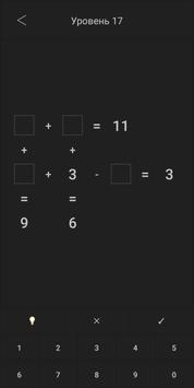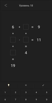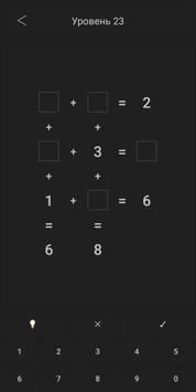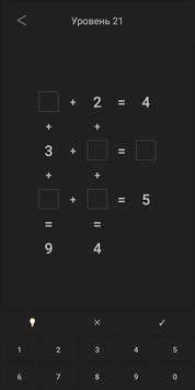 На уровнях математических головоломок будут приведены примеры, где вам необходимо подобрать числа в ячейки таким образом, чтобы получились верные равенства.