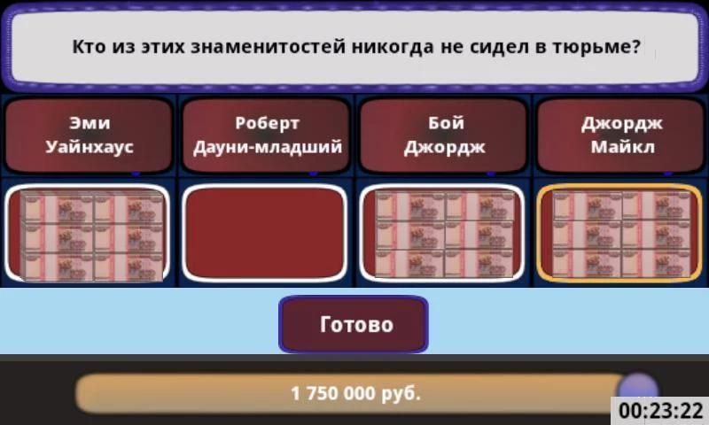 You start the game with 10 million in 40 packs of 250 000 rubles each. Your task is to keep as much money out of the starting amount after answering eight questions proposed.