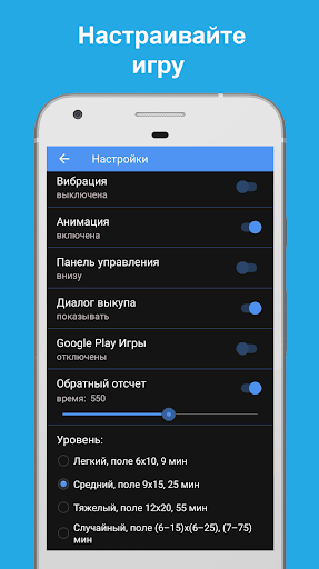 - Уровень с возможностью полной настройки игрового поля вы можете выбрать ширину и высоту игрового поля и количество мин в нем
