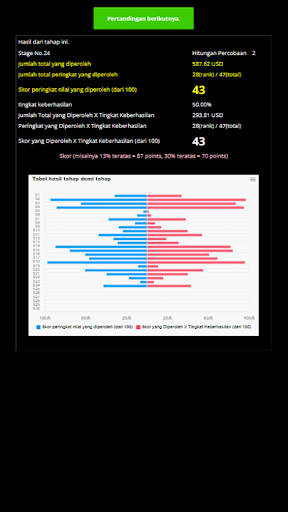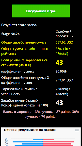 Игра отображает значение отклонения для каждой сделки, позволяя вам проверить свой прогресс с каждой сделкой. Рейтинг этапа рассчитывается по двум категориям: абсолютная ценность рейтинга и абсолютная ценность/количество попыток, необходимых для прохождения этапа, и оценивается по 100-балльной шкале. (88 баллов за 12%).