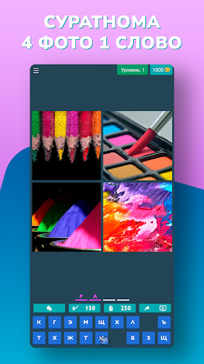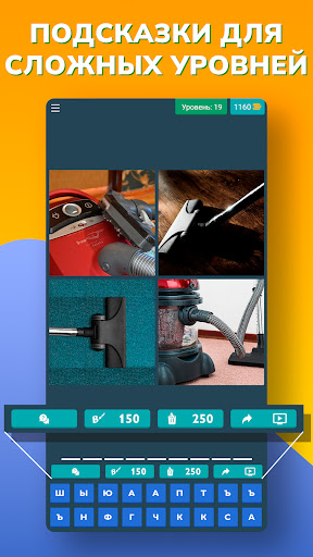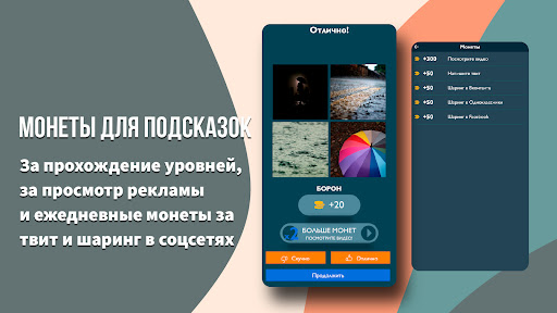 Правила данной игры очень просты: Вам показываются 4 картинки фото, фотки) и Вам нужно отгадать 1 слово которое ассоциируется с этими 4 картинками. Посмотрите на все четыре картинки и проводя аналогию между ними отгадайте слово. Также можете рассмотреть картинки в отдельности, если не разобрали что в картинке. В игре предусмотрено функция увеличения картинки по нажатию, на весь экран. Уровни в игре разные: от самых легких и сравнительно легких до самых сложных. Если Вам уровень покажется сложным используйте подсказки: "Помощь друга", "Показать одну правильную букву", "Убрать все лишние буквы", и "Пройти уровень". Помните, что подсказки кончаются, тратьте их на очень сложные для Вас уровнях. Подсказки выдаются за прохождение уровней и за просмотр рекламы. А также за твит в твиттере; за шаринг в Одноклсниках, ВКонтакте, и в Фейсбук, ежедневно. Также, если возникнут вопросы пишете мне в почту (pocboz@gmail.com) и я обязательно отвечу Вам.