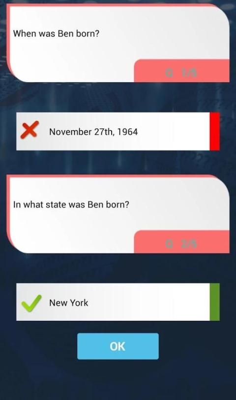 Это забавная викторина игра, где вы отвечаете на вопросы, связанные с участием Бена Стиллера. Есть различные уровни в игре викторины Бен Стиллер, каждый уровень содержит много интересных вопросов о Бен Стиллер Вы должны достичь необходимых критериев, чтобы разблокировать уровни. Бен Стиллер мелочи Интересно, быстрый и простой в использовании.