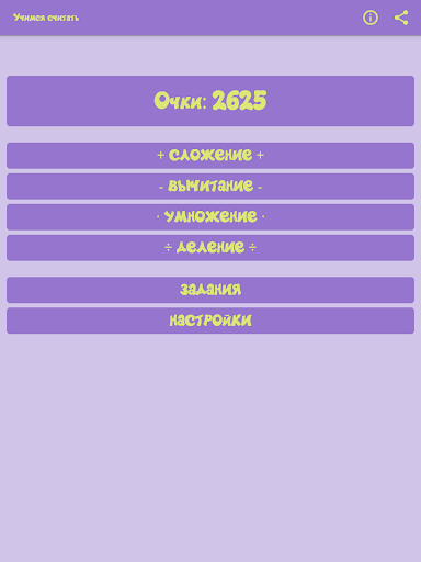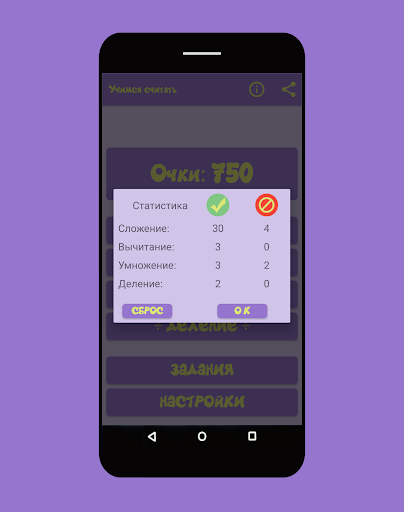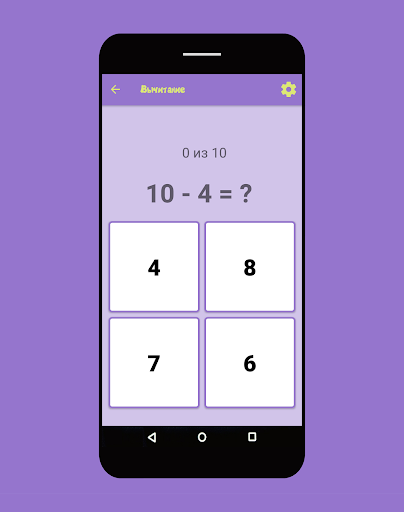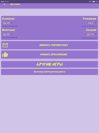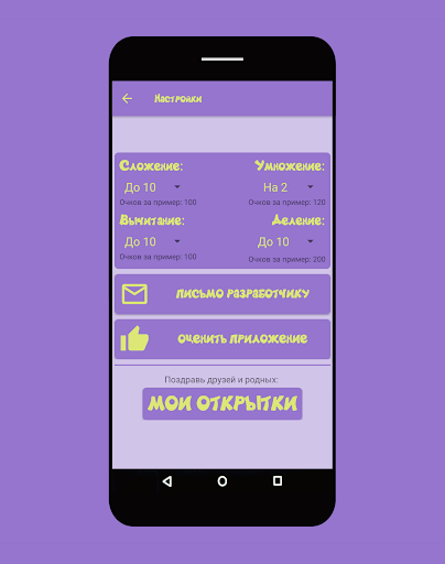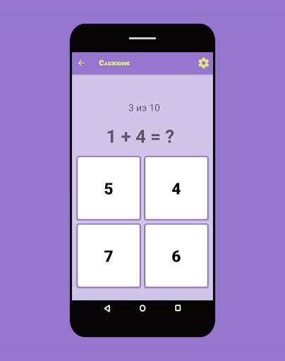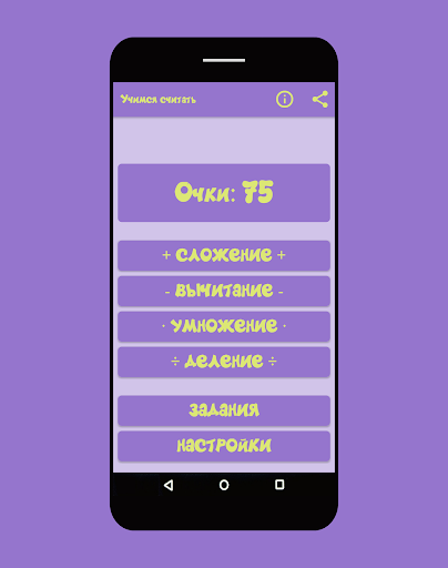Приложение создано для тренировки навыков счета. Вы можете самостоятельно изменять уровень сложности примеров, что позволяет ребенку постепенно совершенствоваться.