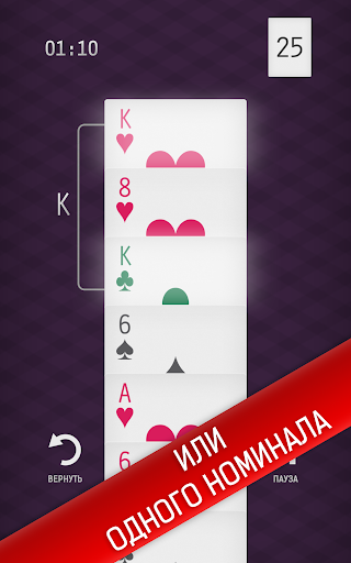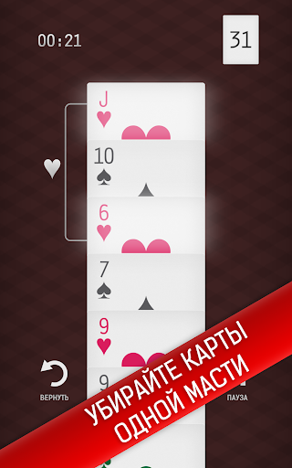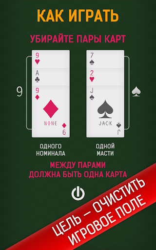 Правила предельно просты: находите пары карт одной масти или одного номинала. Цель — очистить доску. Но не дайте этой простоте вас одурачить! Пасьянс: Пары карт прячет за собой очень глубокую тактику. Вам нужно думать на несколько ходов наперед!