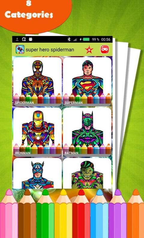 SuperHero раскраска является образовательная игра окраски предназначена для обоих мальчиков и девочек, которые любят цвет супер Heros символы, такие как Супермен, Человек-паук, Ironman, туши, Капитан Америка и Бэтмен. Дети будут учиться рисовать героев картины правильно используя правильные цвета. и будет иметь столько весело провести время каждый день, когда они играют на этой раскраске игре.