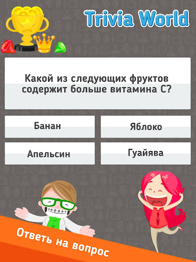 Выберите правильный ответ из 4 возможных. Все вопросы делятся на 6 категорий: развлечения, спорт, наука, география, история и искусство. Колесо фортуны выбирает из какой категории вопрос будет. Какая категория твоя любимая?